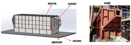 (3)储热装置。储放热过程气体流向相反,随着流动,气体中的烟尘沉降至底部灰斗,通过输灰器连通沿流程方向的排灰口,将装置底部灰输送至端部,从而排出设备。如果烟气含尘量较小,可不设灰斗及排灰结构,提高系统经济性。